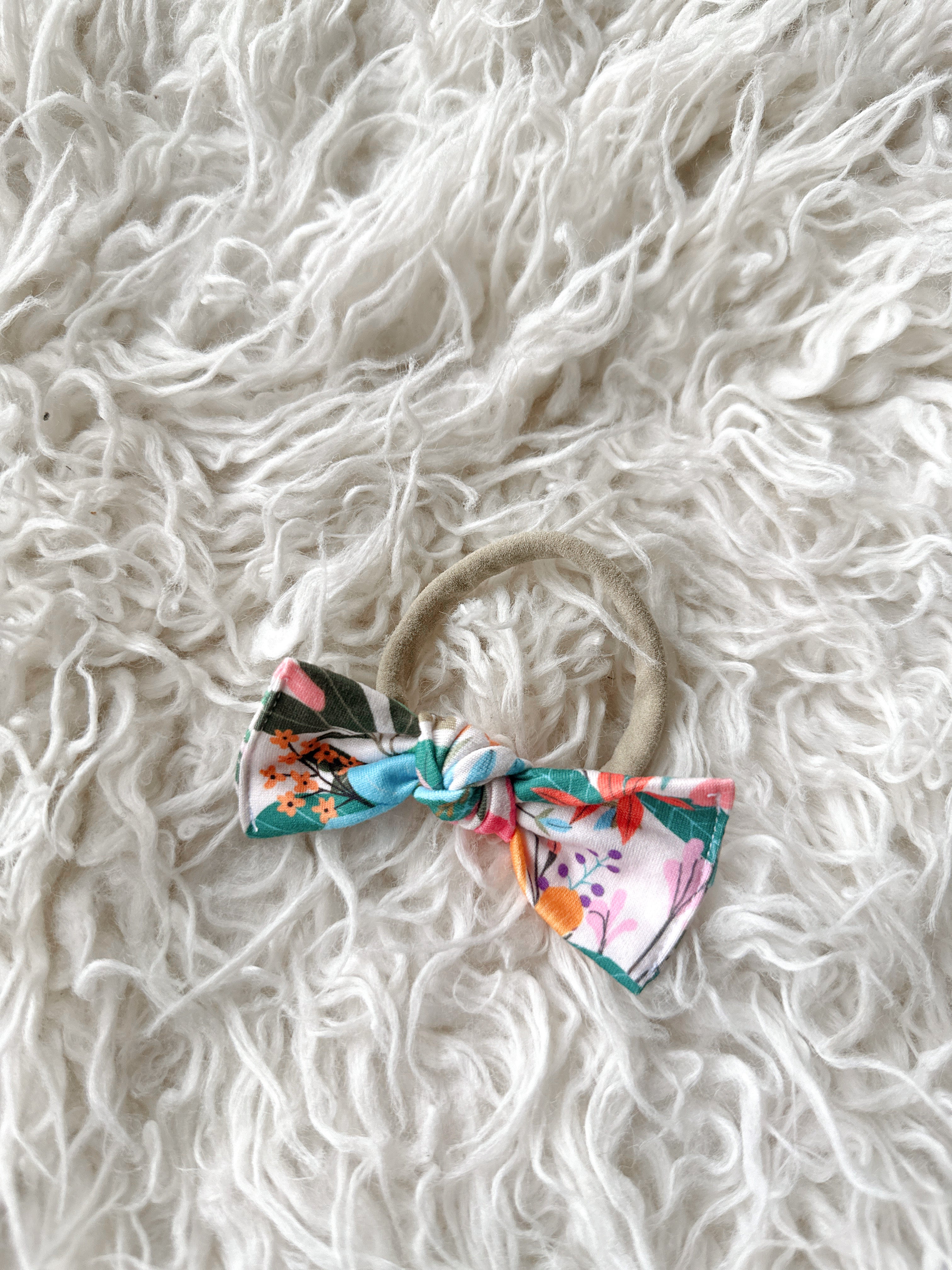 This thin stretchy nylon band will fit newborn - 12mo comfortably. Features a 3” sewn, hand tied bow.