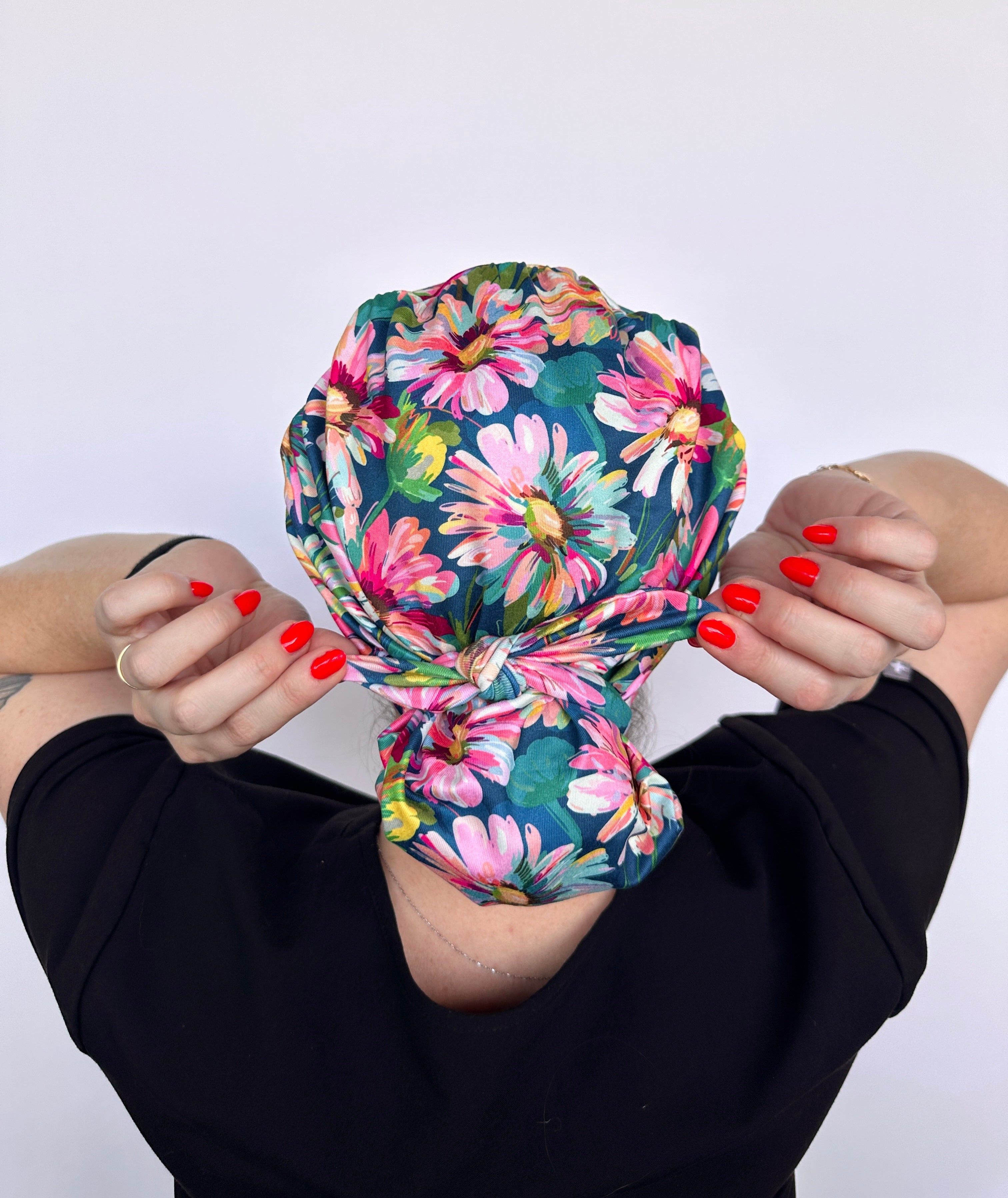 Meet the first-of-its-kind scrub hat that transforms from slouchy to ponytail style in seconds! Each hat includes a matching tie that can slip over your ponytail or bun like a scrunchie or be tied around for a more secure fit.