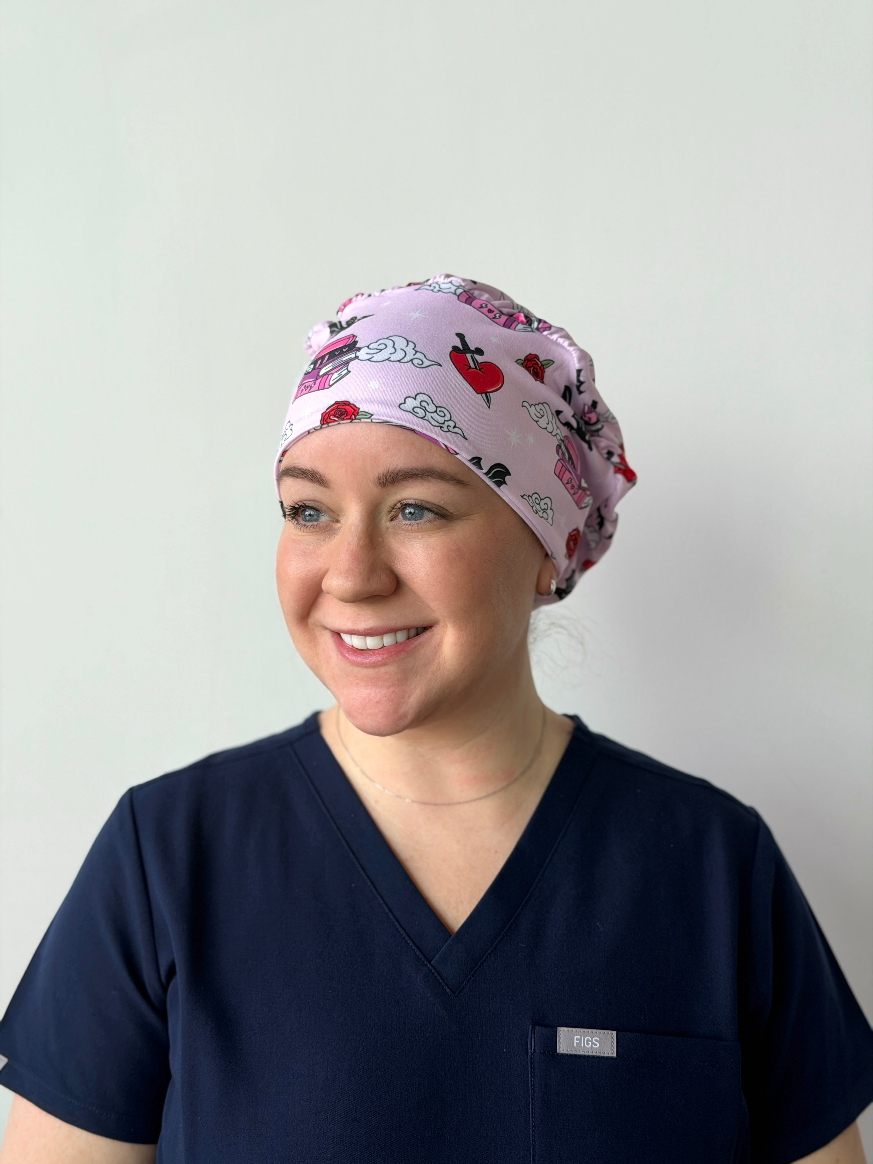 Meet the first-of-its-kind scrub hat that transforms from slouchy to ponytail style in seconds! Each hat includes a matching tie that can slip over your ponytail or bun like a scrunchie or be tied around for a more secure fit.