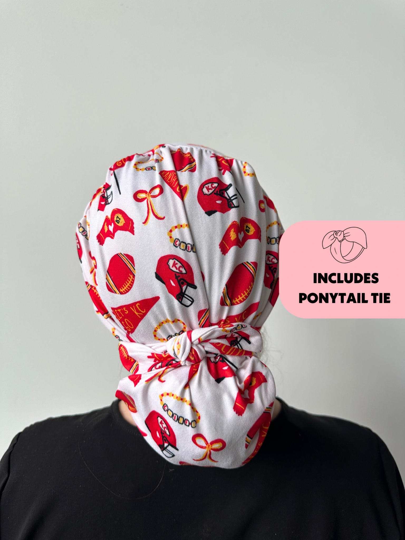 Meet the first-of-its-kind scrub hat that transforms from slouchy to ponytail style in seconds! Each hat includes a matching tie that can slip over your ponytail or bun like a scrunchie or be tied around for a more secure fit.