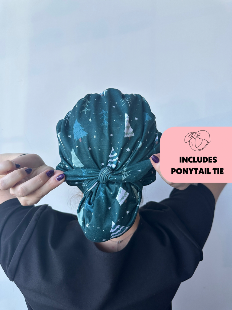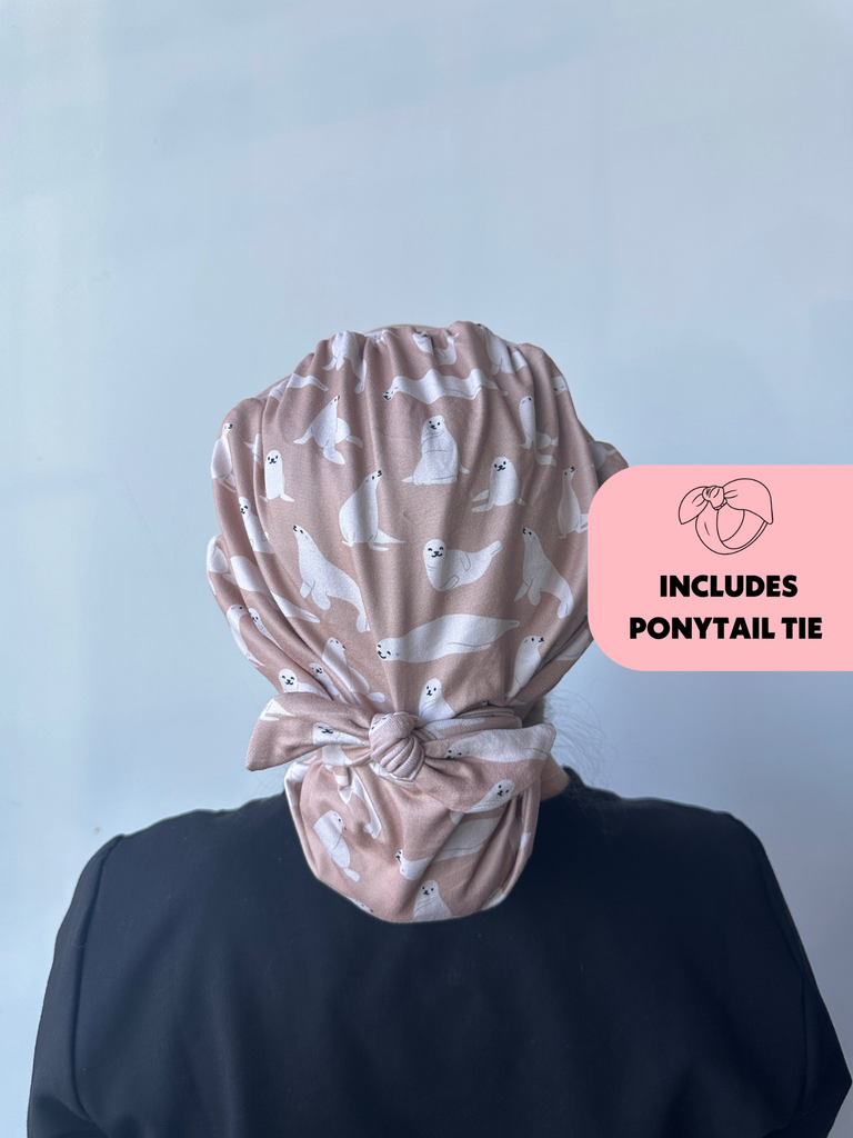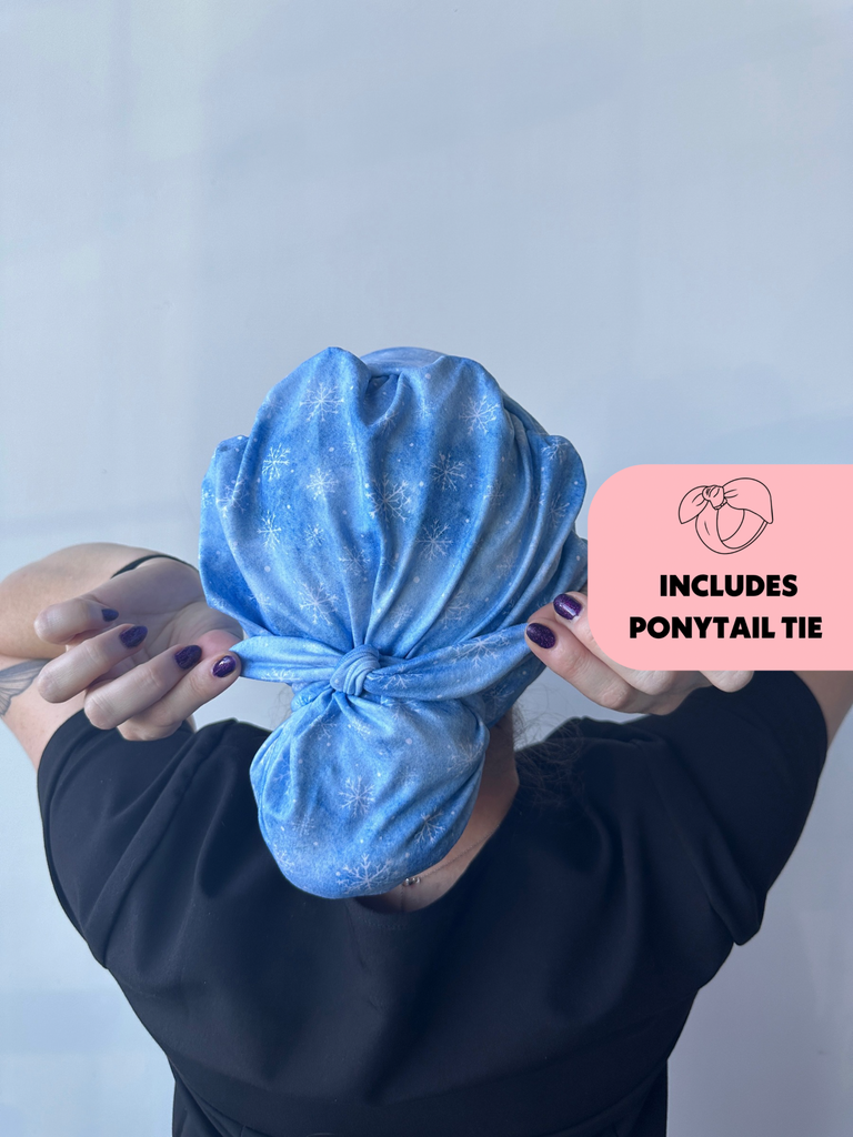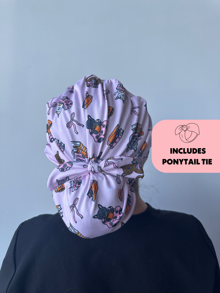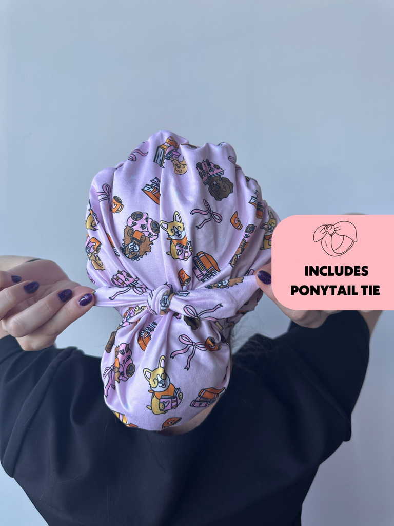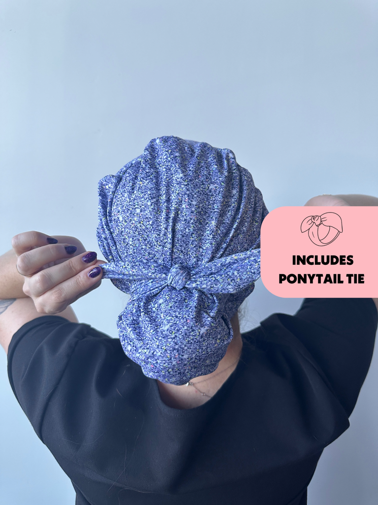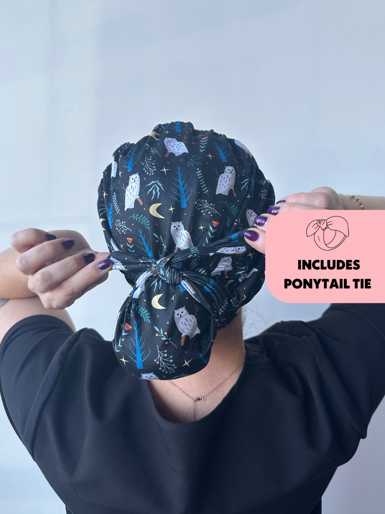 Meet the first-of-its-kind scrub hat that transforms from slouchy to ponytail style in seconds! Each hat includes a matching tie that can slip over your ponytail or bun like a scrunchie or be tied around for a more secure fit.