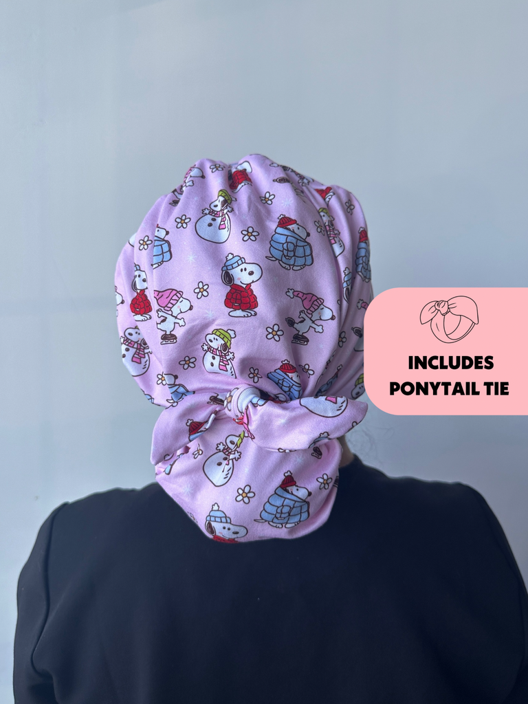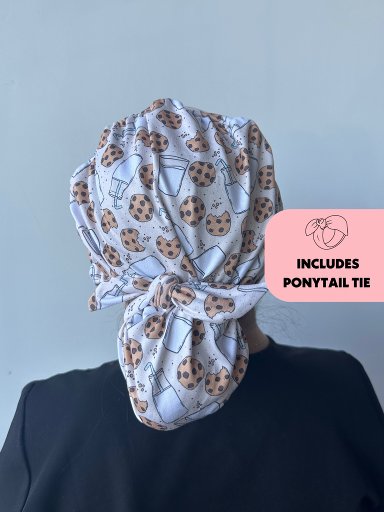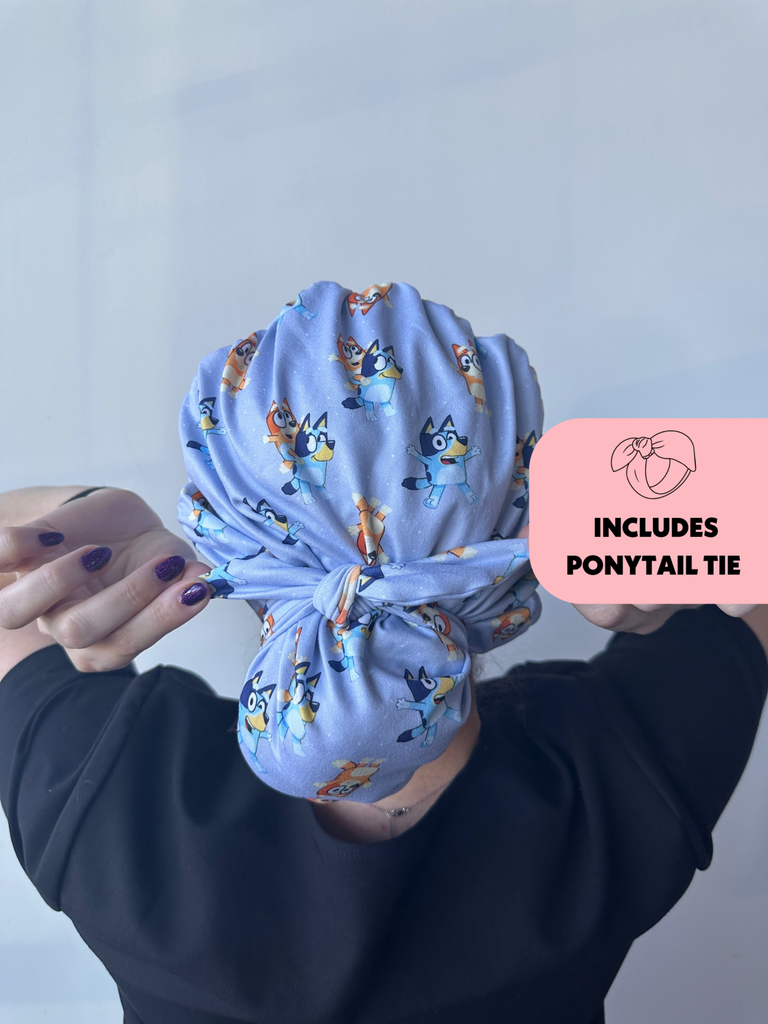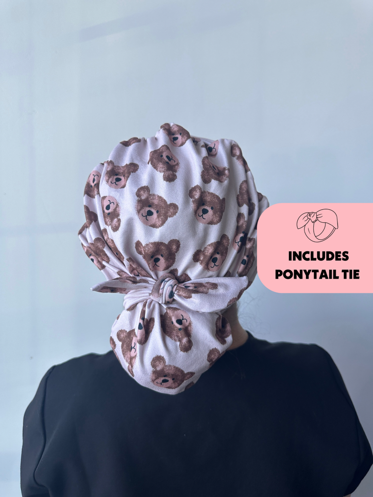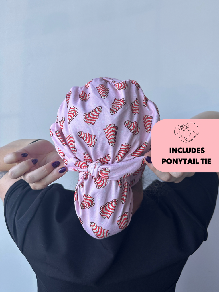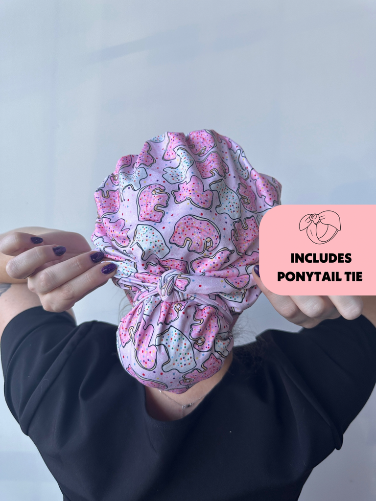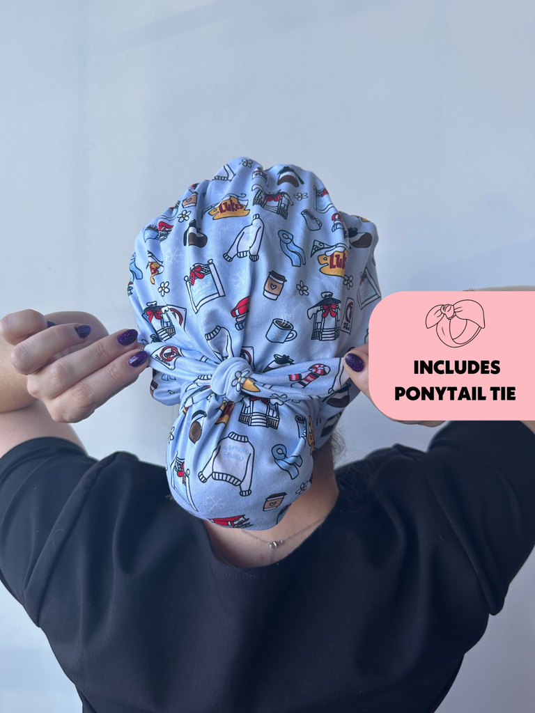 Meet the first-of-its-kind scrub hat that transforms from slouchy to ponytail style in seconds! Each hat includes a matching tie that can slip over your ponytail or bun like a scrunchie or be tied around for a more secure fit.