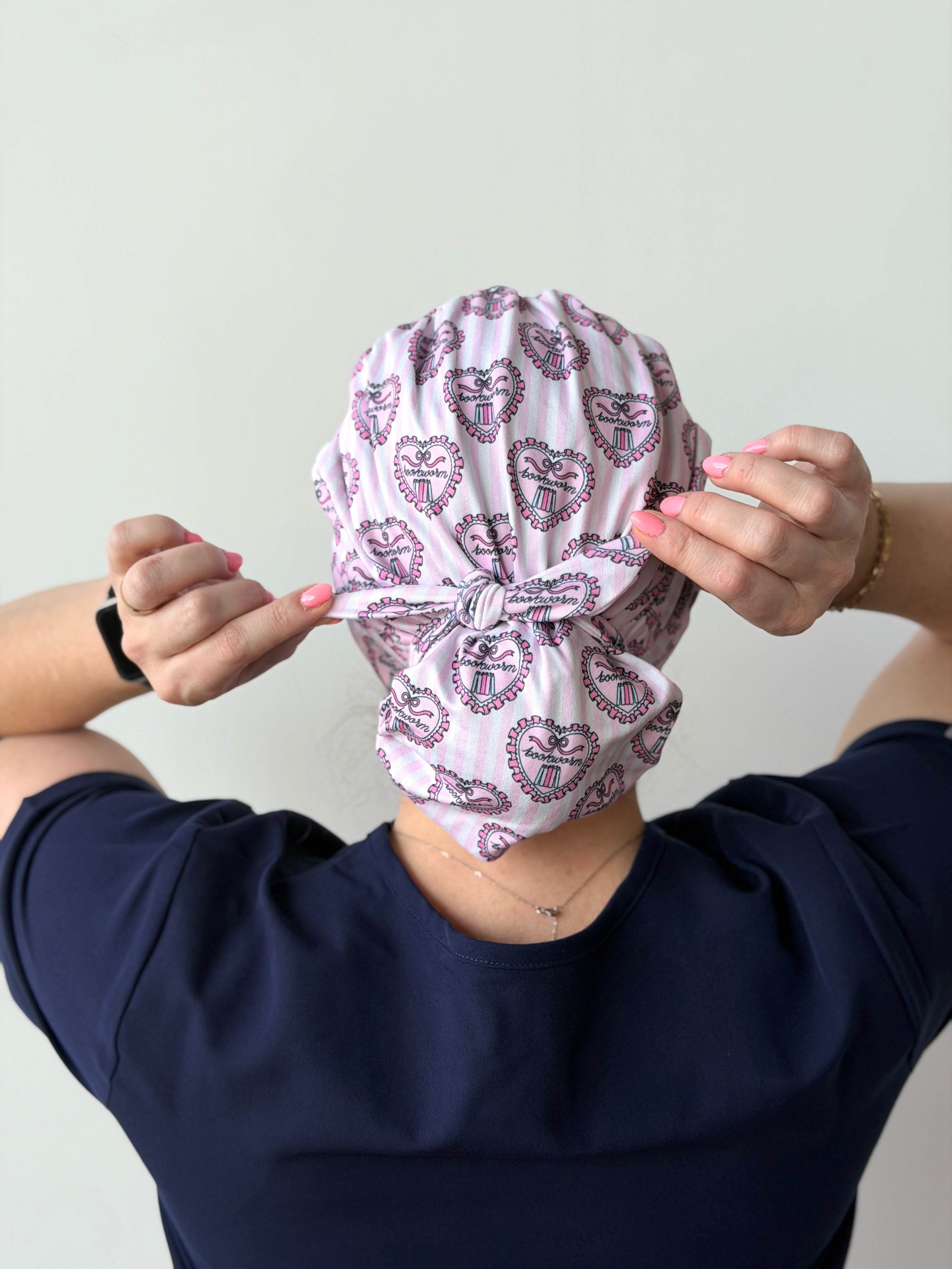 Meet the first-of-its-kind scrub hat that transforms from slouchy to ponytail style in seconds! Each hat includes a matching tie that can slip over your ponytail or bun like a scrunchie or be tied around for a more secure fit.