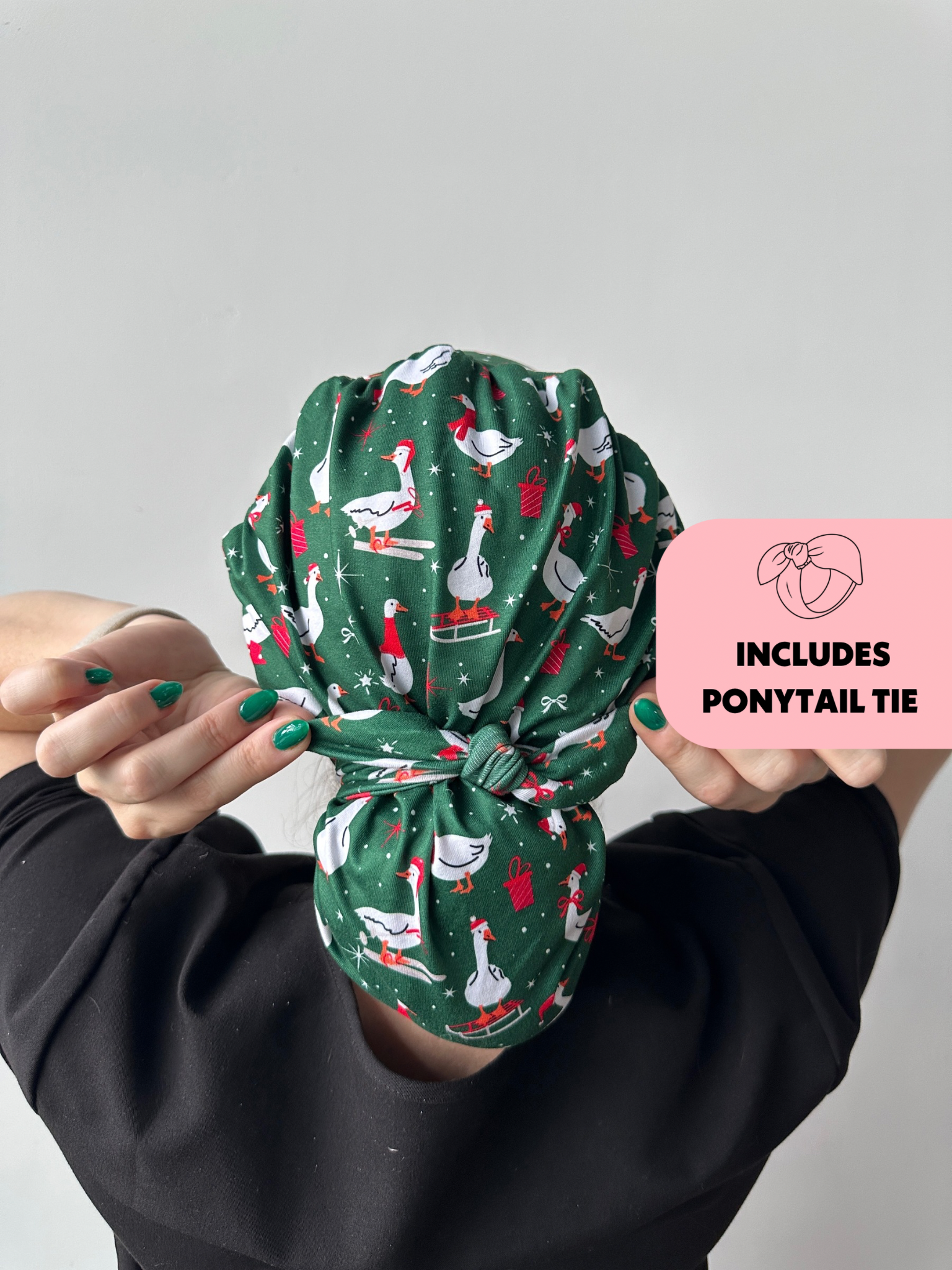 Meet the first-of-its-kind scrub hat that transforms from slouchy to ponytail style in seconds! Each hat includes a matching tie that can slip over your ponytail or bun like a scrunchie or be tied around for a more secure fit.