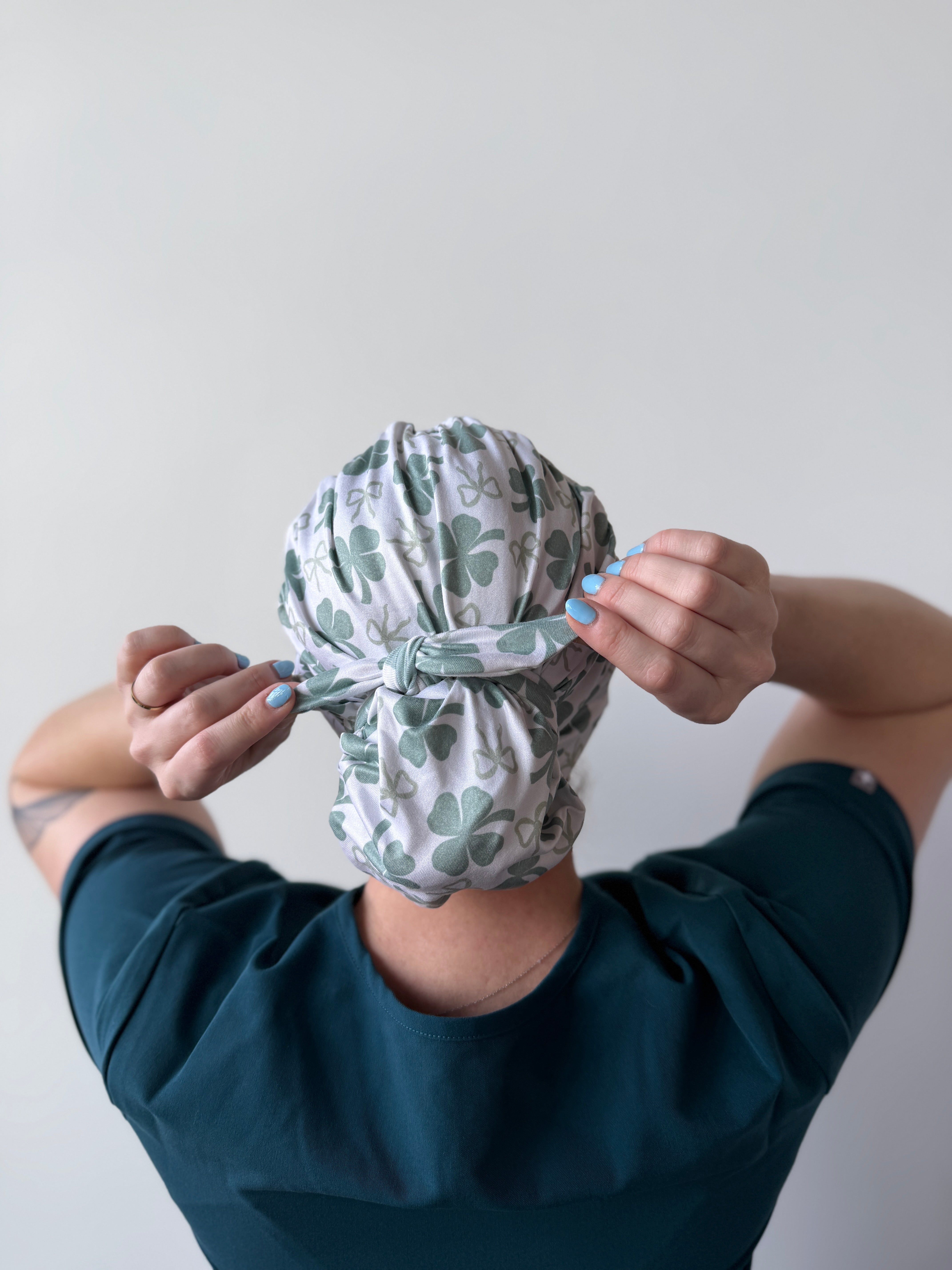 Meet the first-of-its-kind scrub hat that transforms from slouchy to ponytail style in seconds! Each hat includes a matching tie that can slip over your ponytail or bun like a scrunchie or be tied around for a more secure fit.