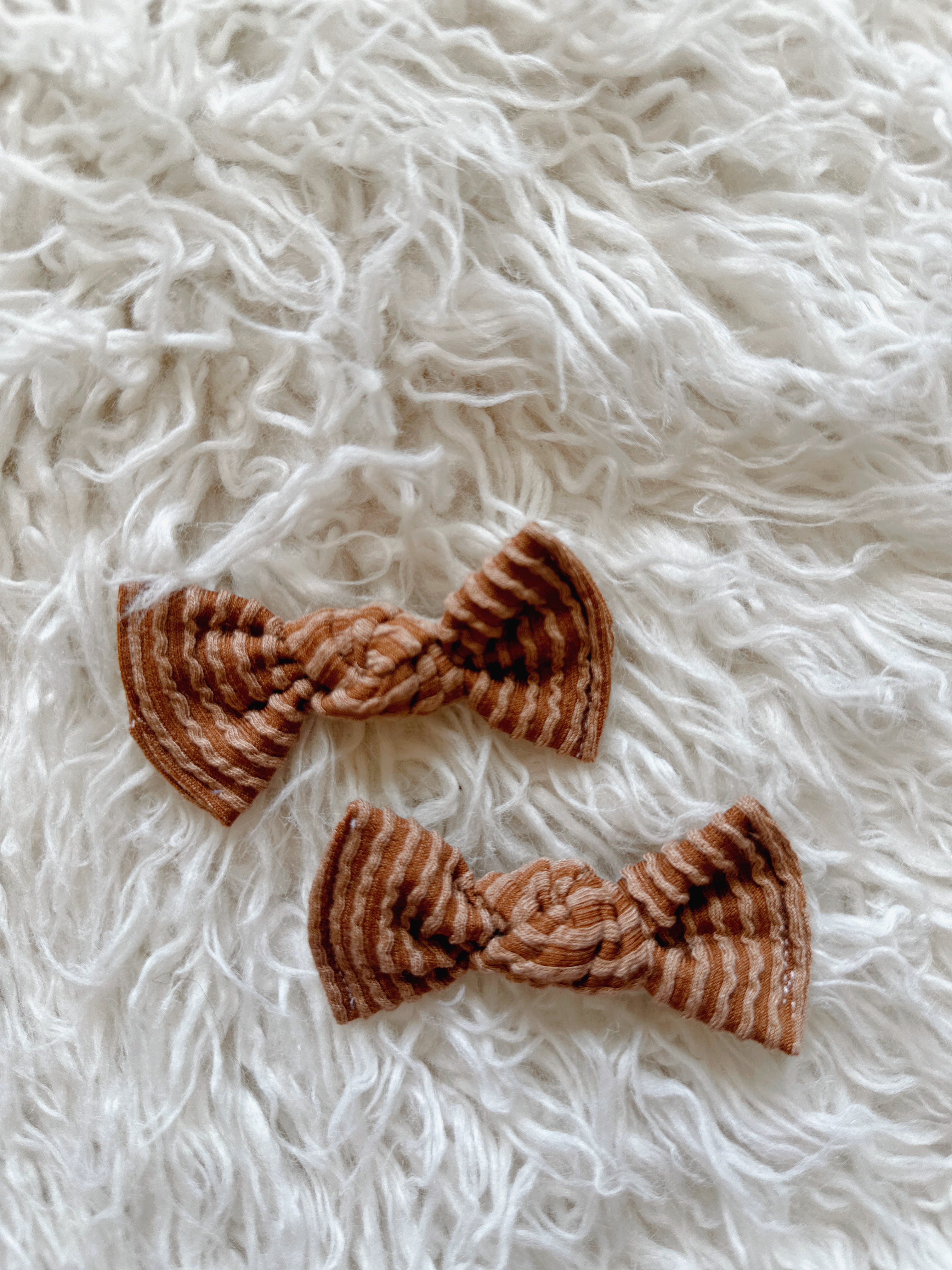 - 3” hand-tied bows crafted from soft, ribbed knit fabric