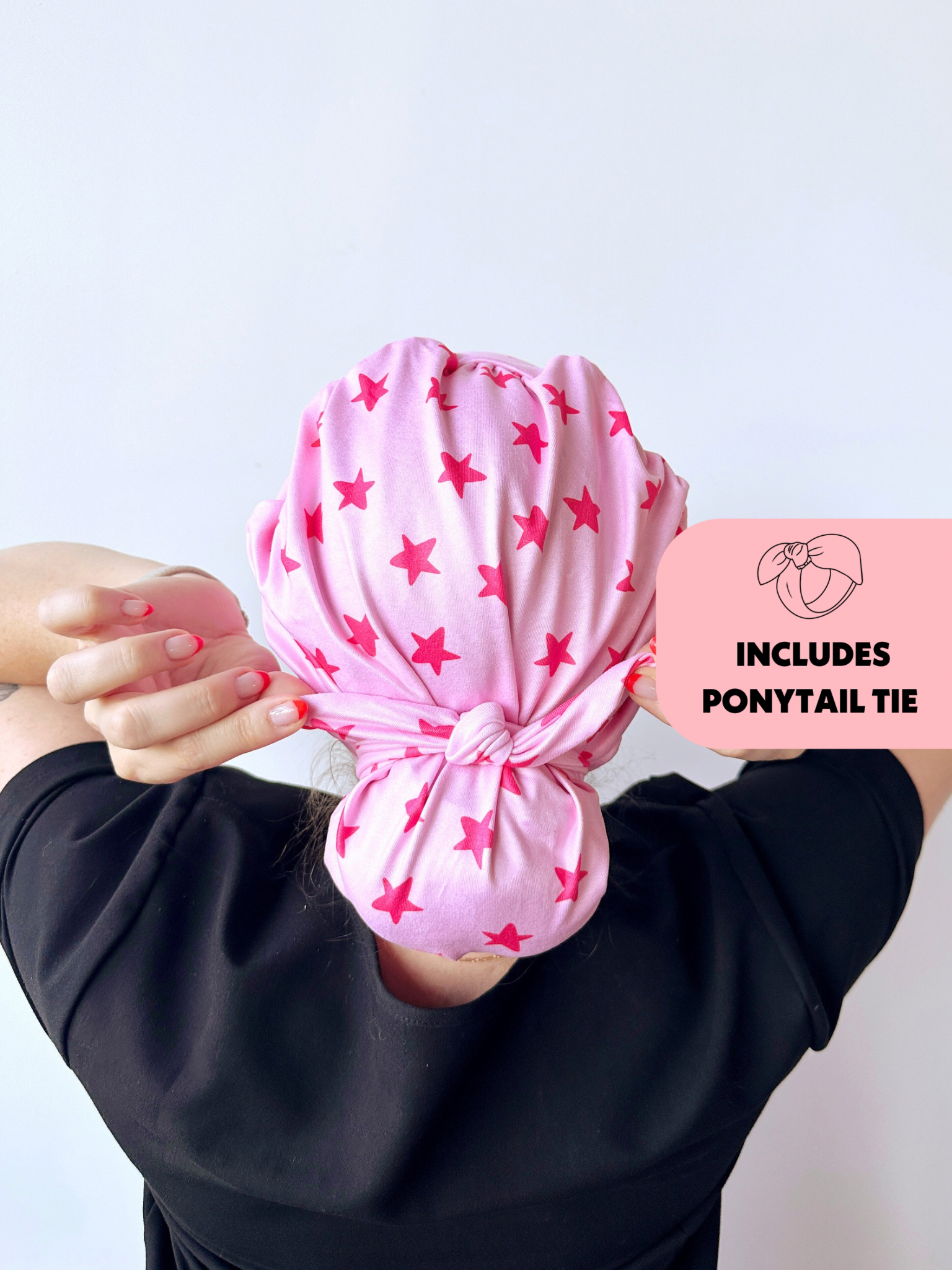 Meet the first-of-its-kind scrub hat that transforms from slouchy to ponytail style in seconds! Each hat includes a matching tie that can slip over your ponytail or bun like a scrunchie or be tied around for a more secure fit.