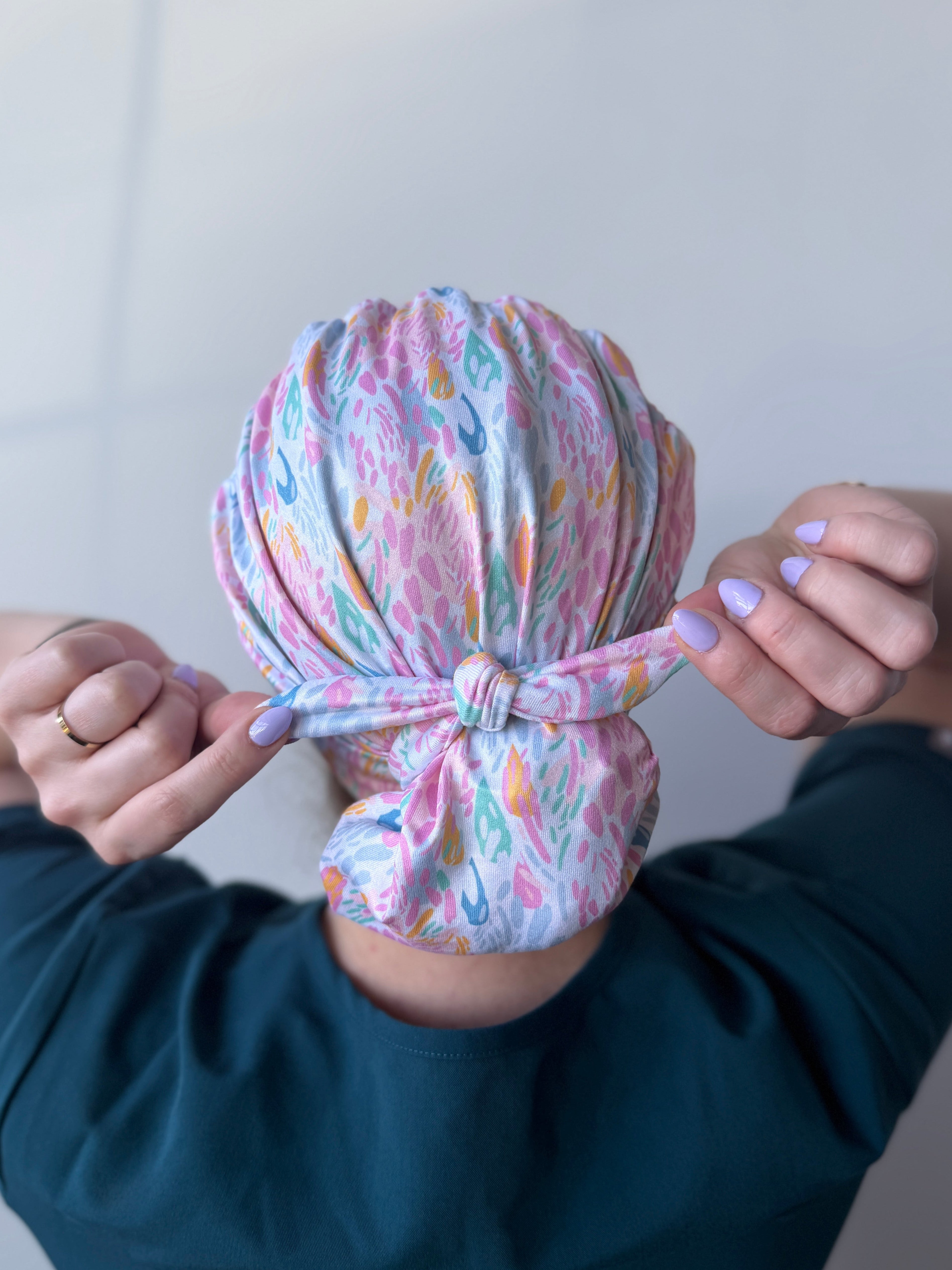 Meet the first-of-its-kind scrub hat that transforms from slouchy to ponytail style in seconds! Each hat includes a matching tie that can slip over your ponytail or bun like a scrunchie or be tied around for a more secure fit.