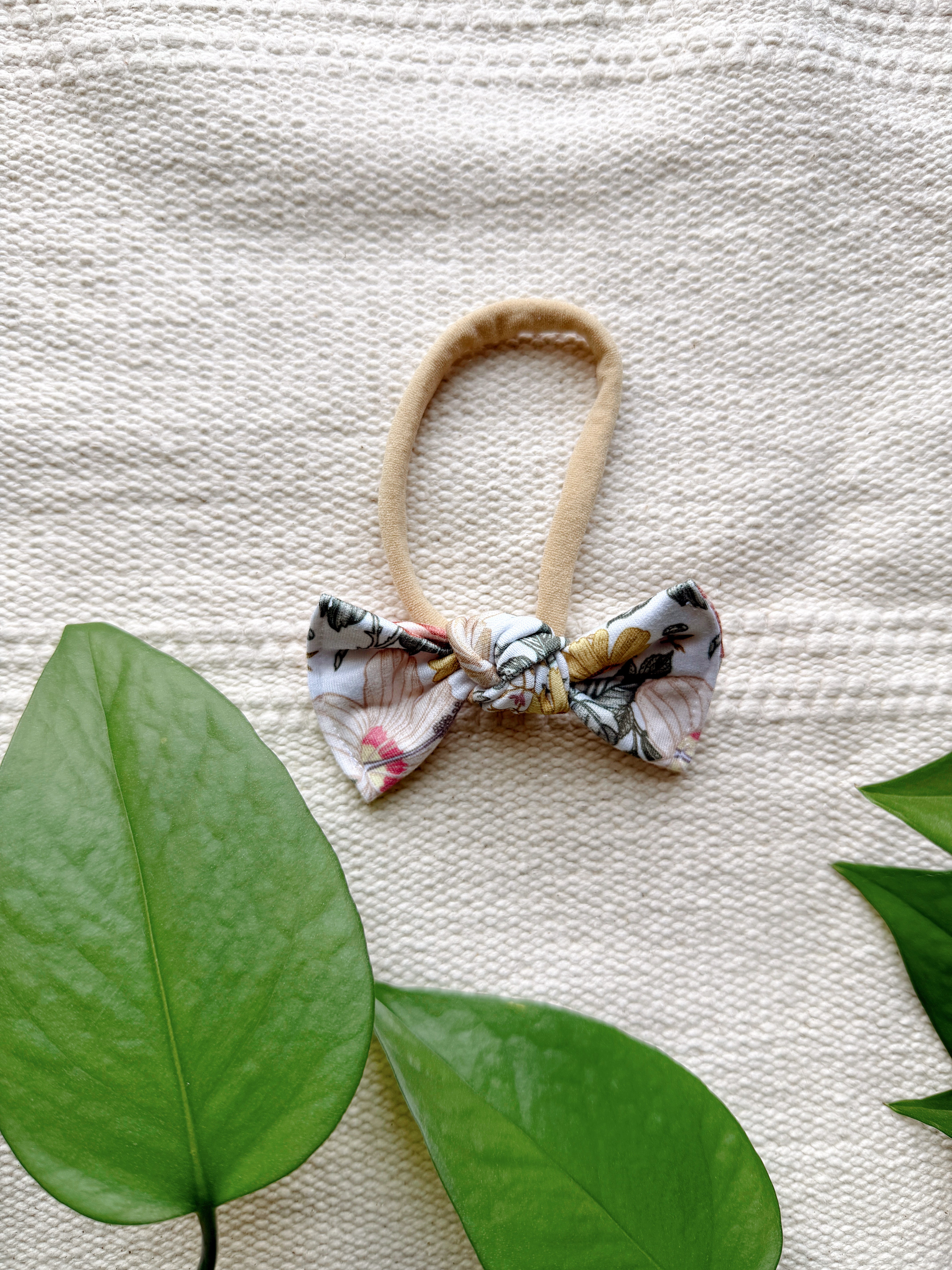 This thin stretchy nylon band will fit newborn - 12mo comfortably. Features a 3” sewn, hand tied bow.
